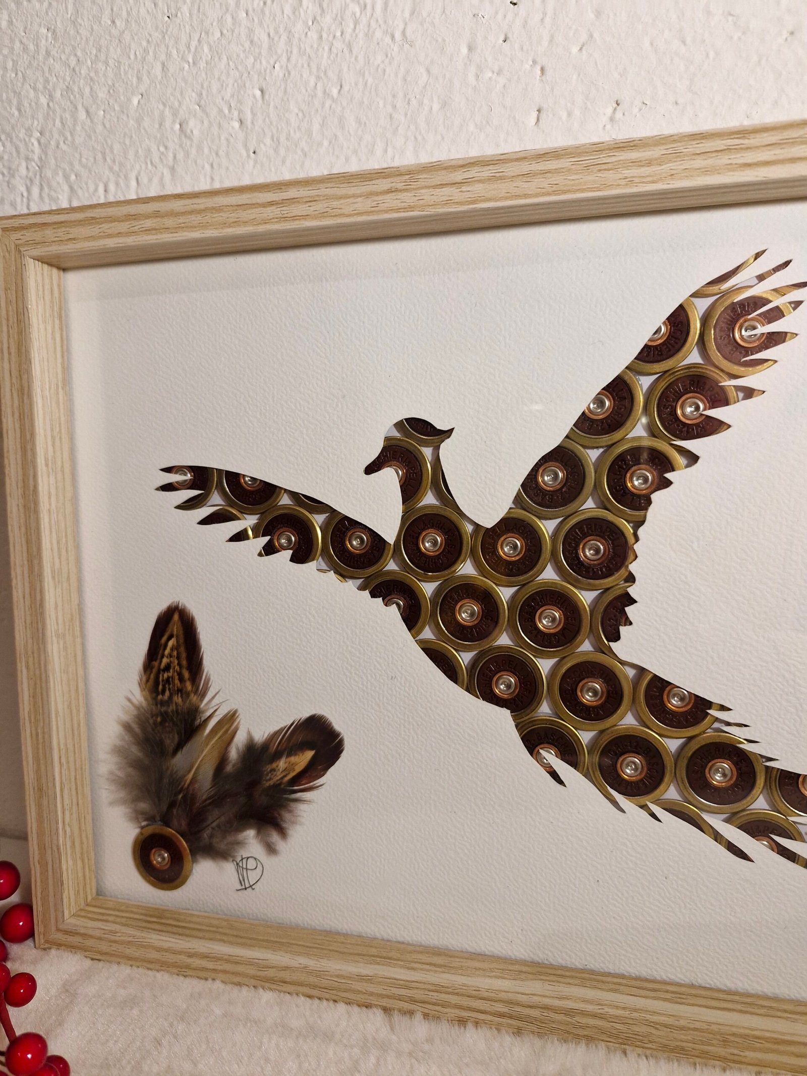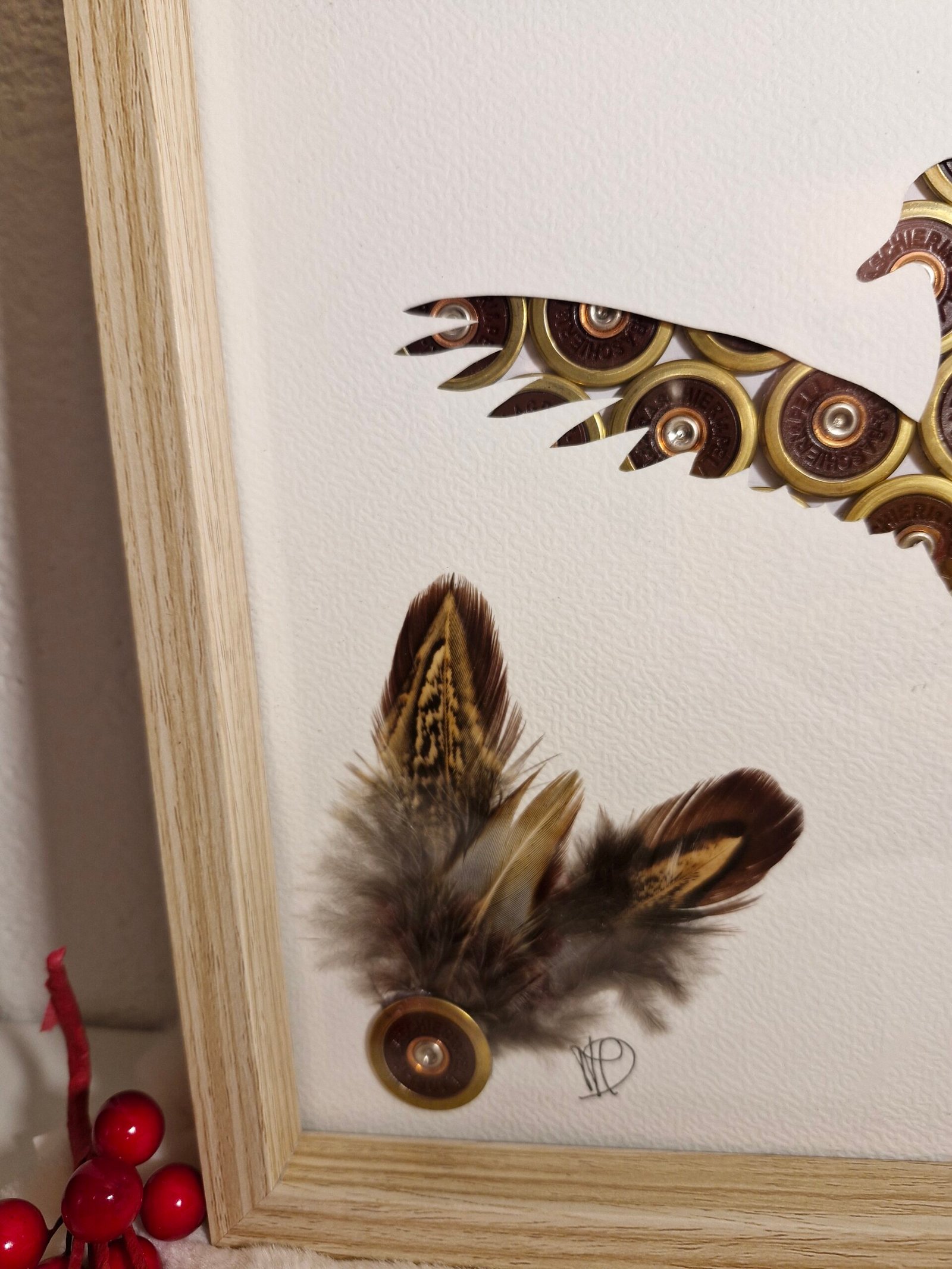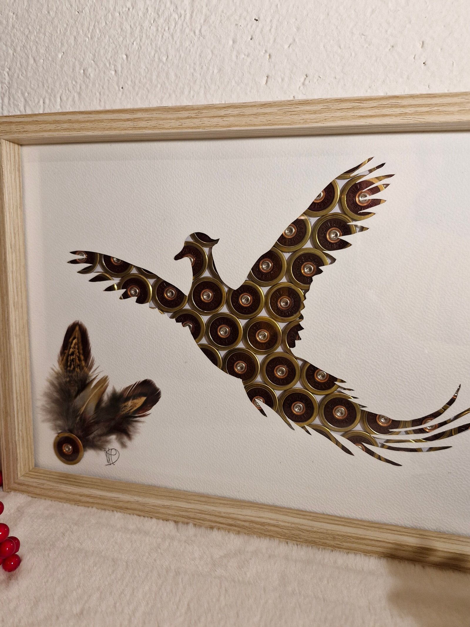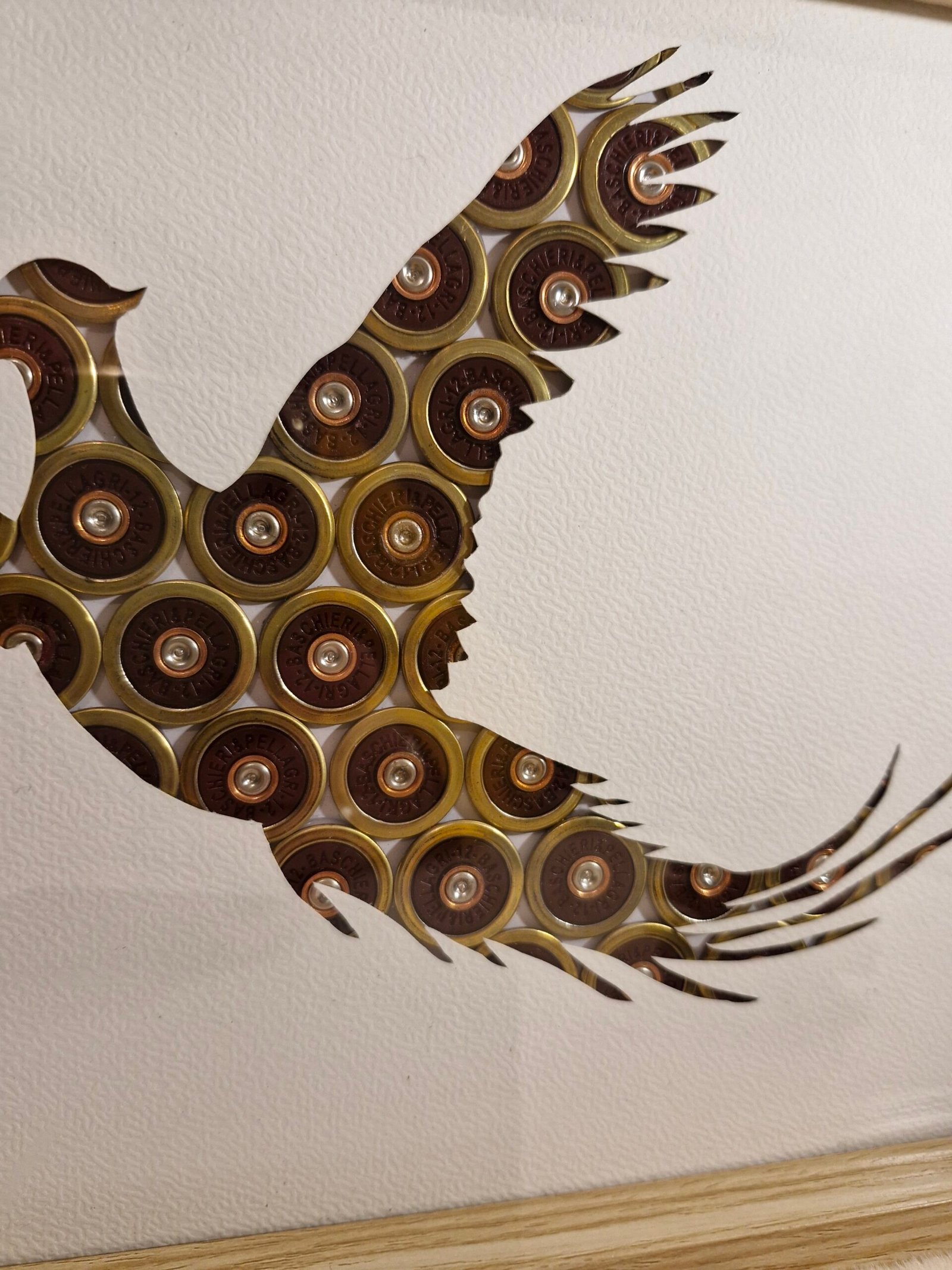 Jolie, faisan cette fois-ci réalisé avec des douilles de cartouche calibre 12 mm de couleur bordeaux et dorée.