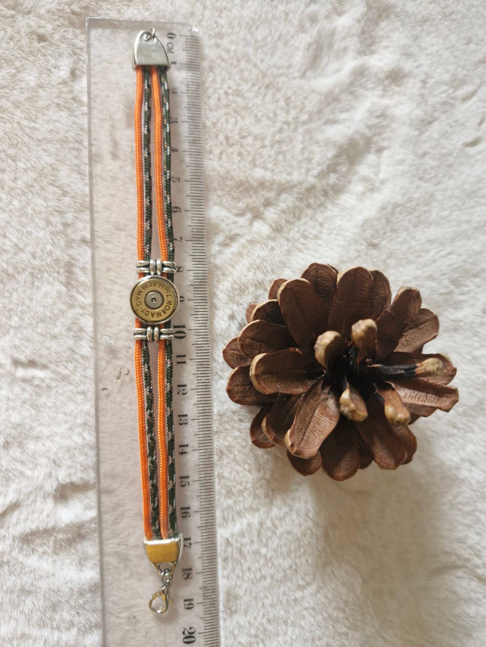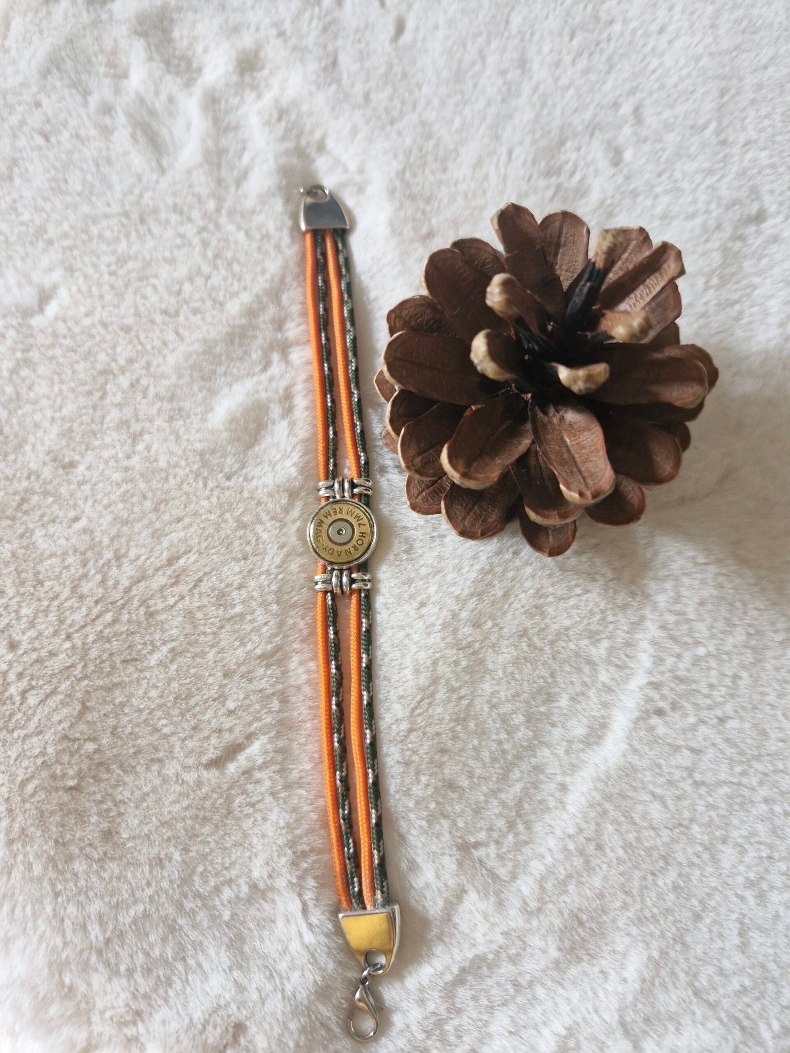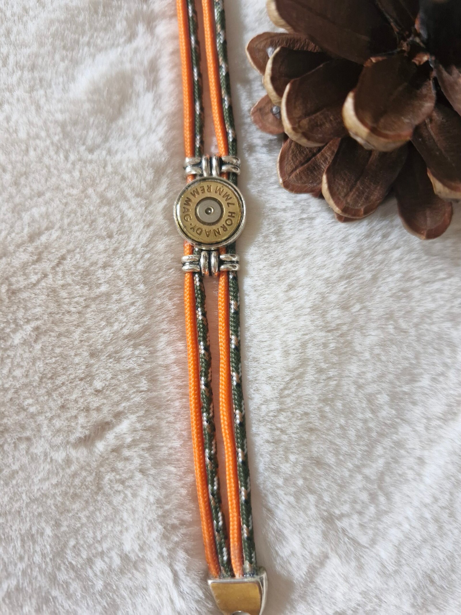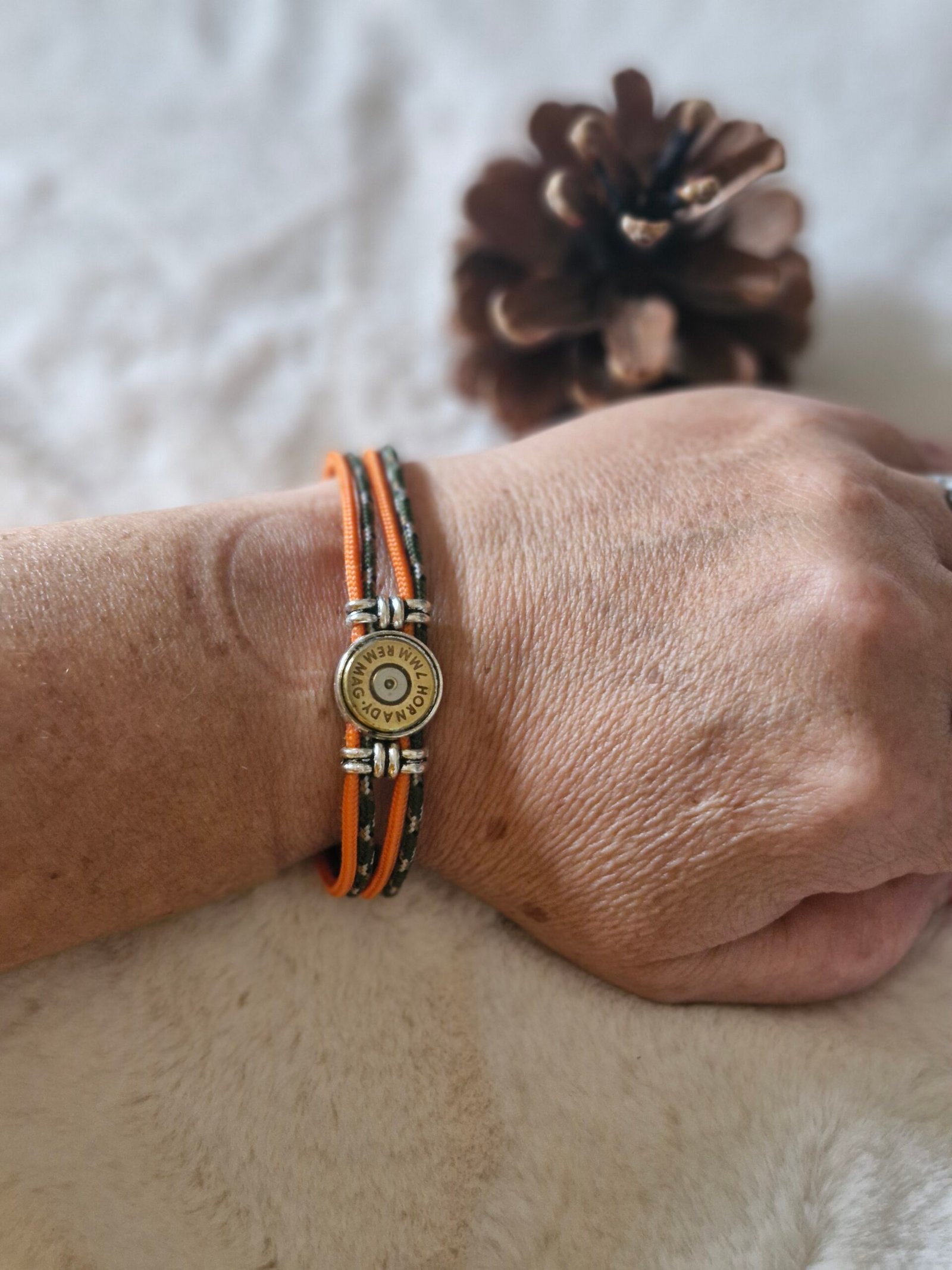 Bracelet en cordons résistants aux tons naturels, agrémenté d’une douille de chasse recyclée en son centre. Un bijou au style rustique et authentique, inspiré de la nature et de l’univers chasse. Léger, confortable et original, il se porte facilement au quotidien.