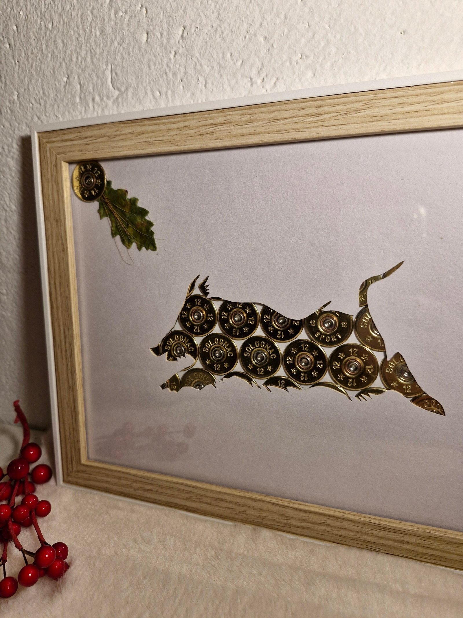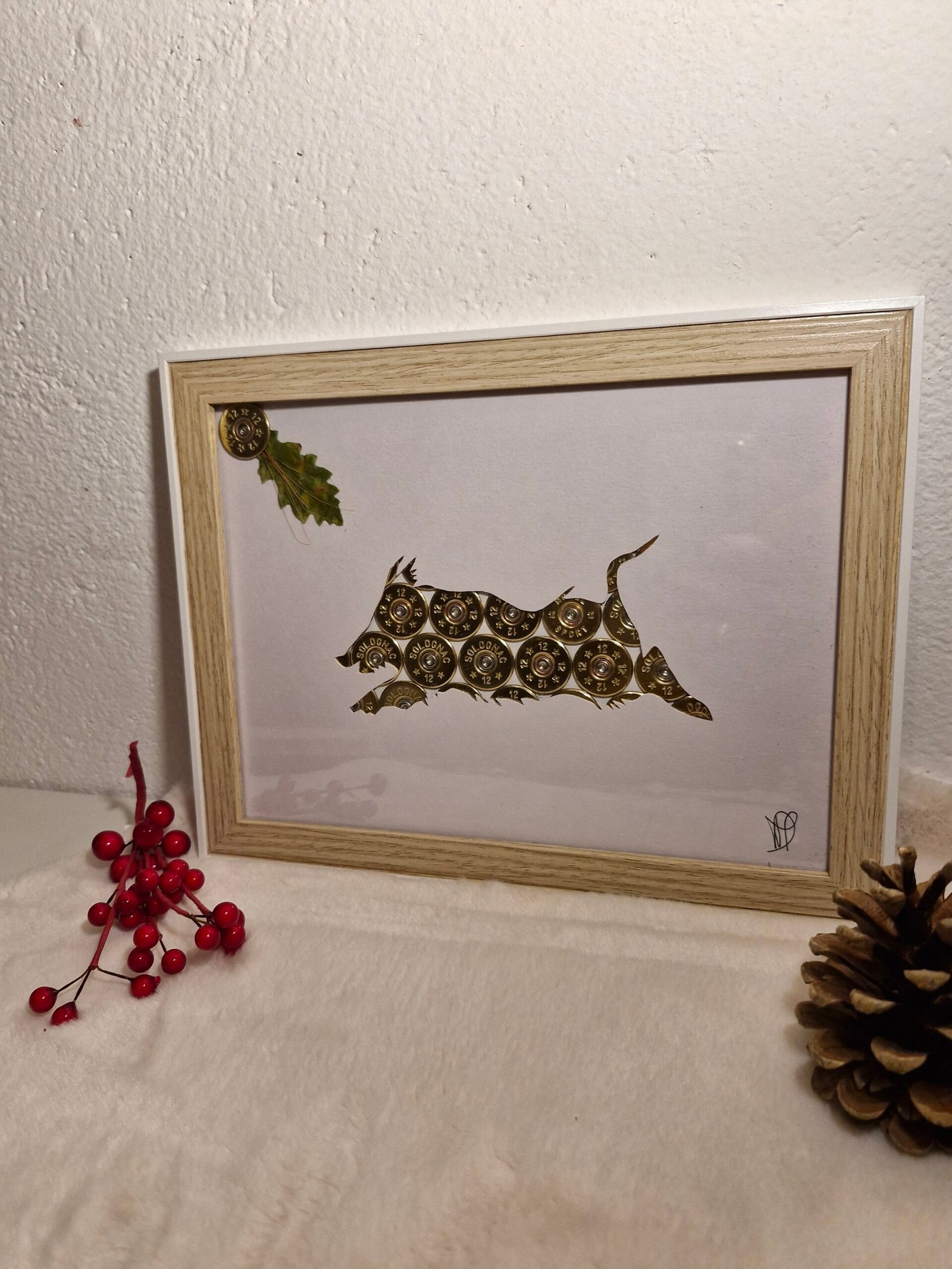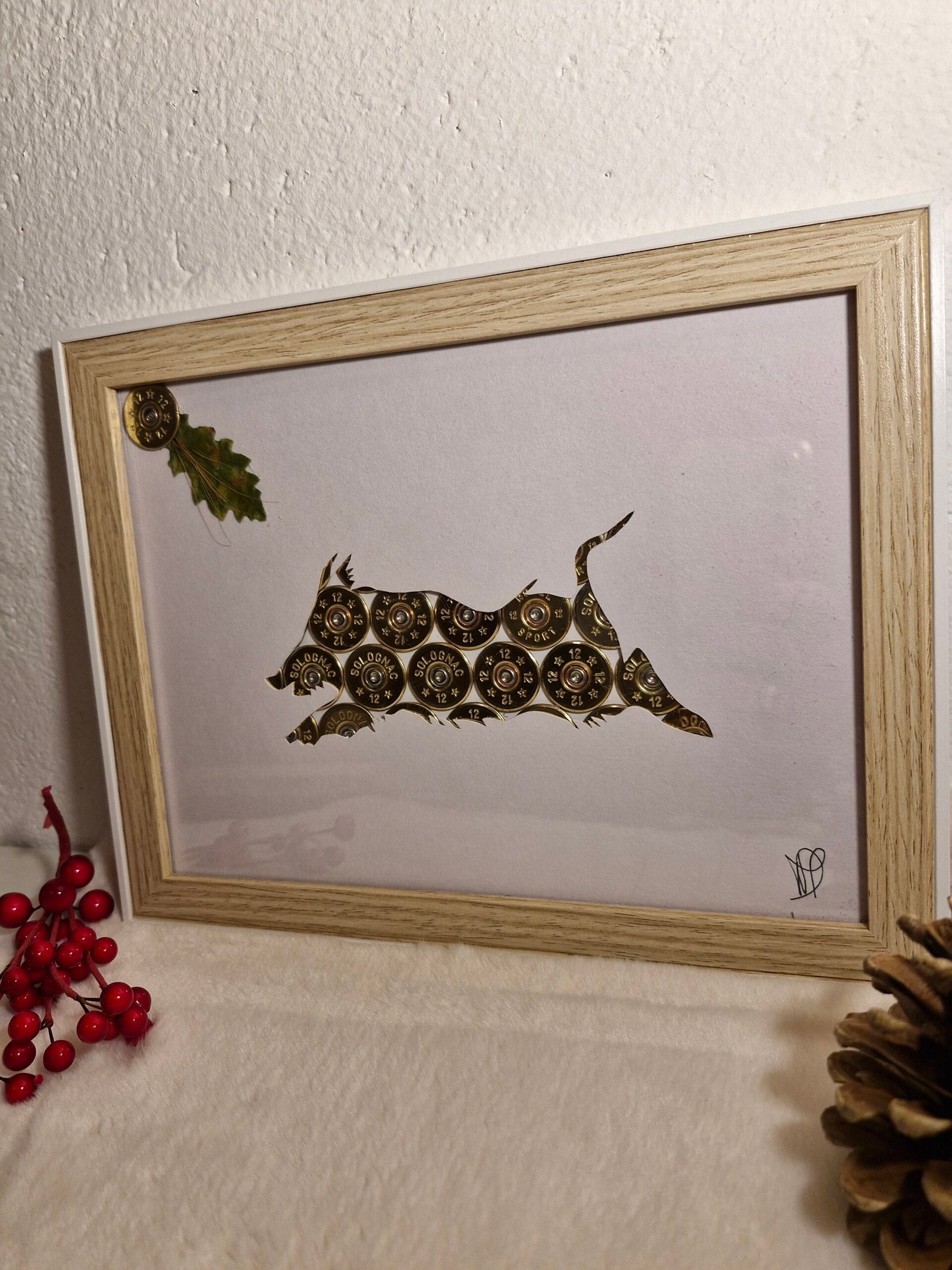 Cadre sanglier réalise avec de vrais douille de cartouche dore calibre 12mm.