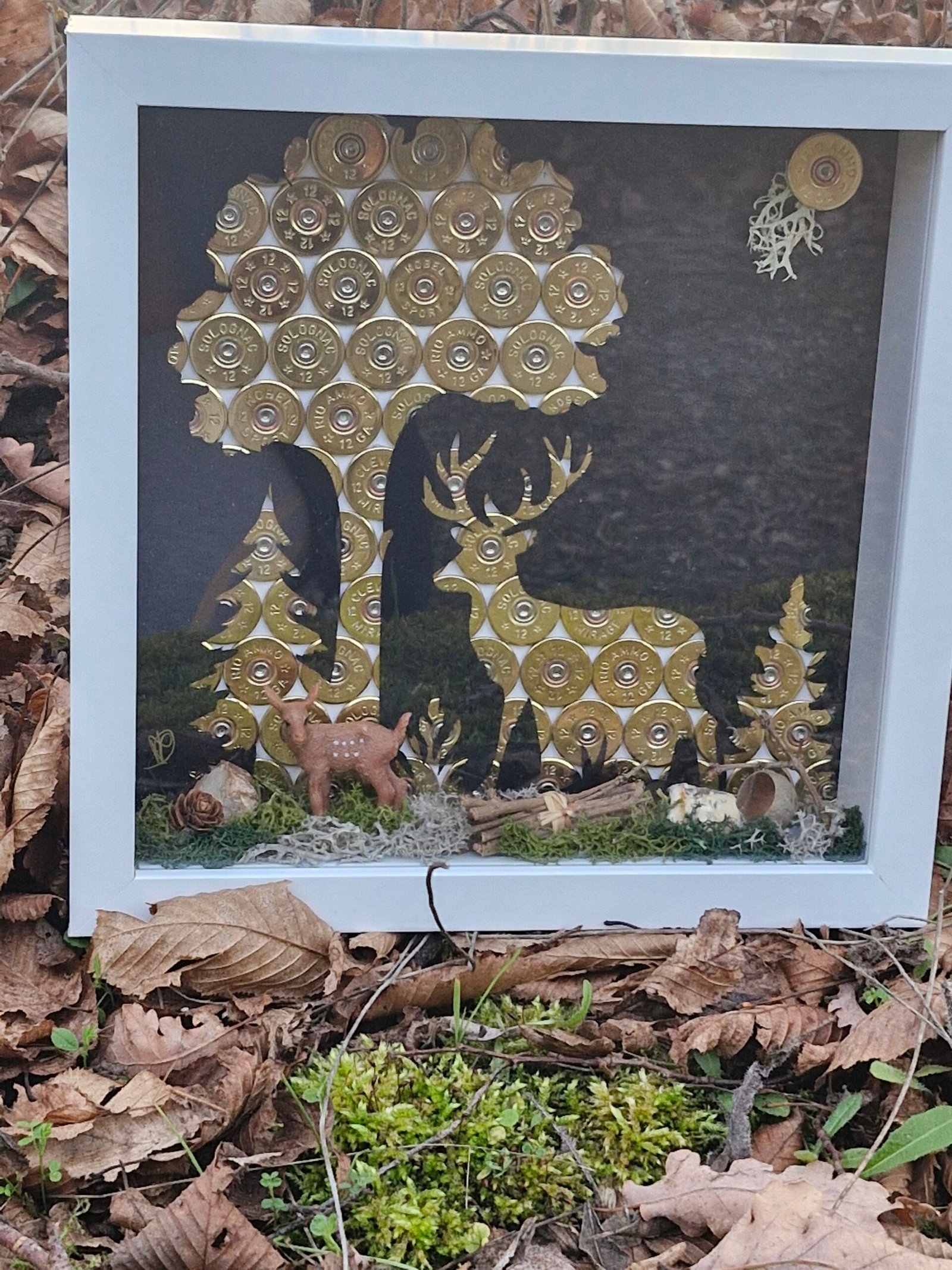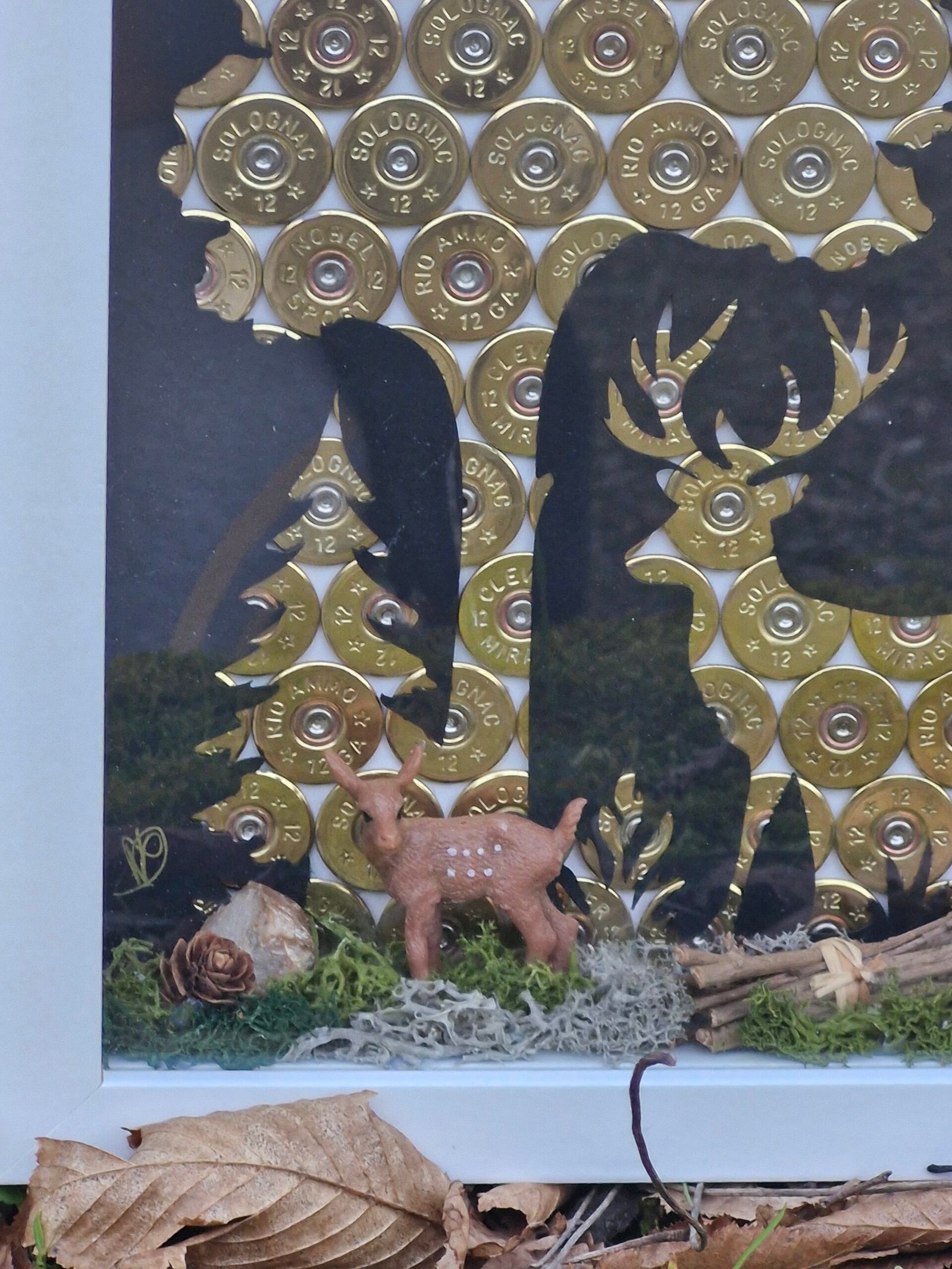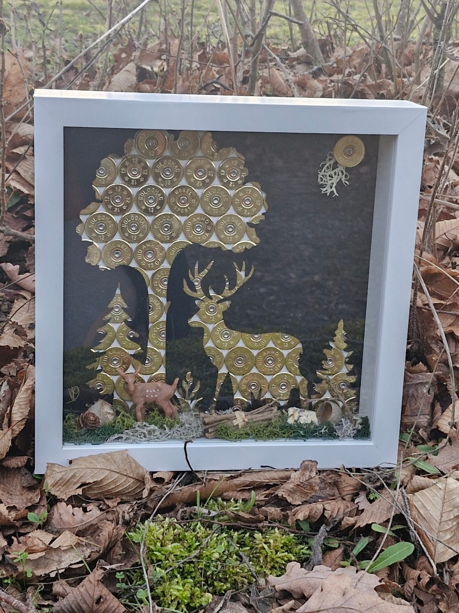 Cé cadre décorative artisanal représente un cerf majestueux  au cœur da foret, entièrement réalise à partir de cartouches recyclée de chasse , une scène naturelle et authentique , sublimée par des éléments végétaux.