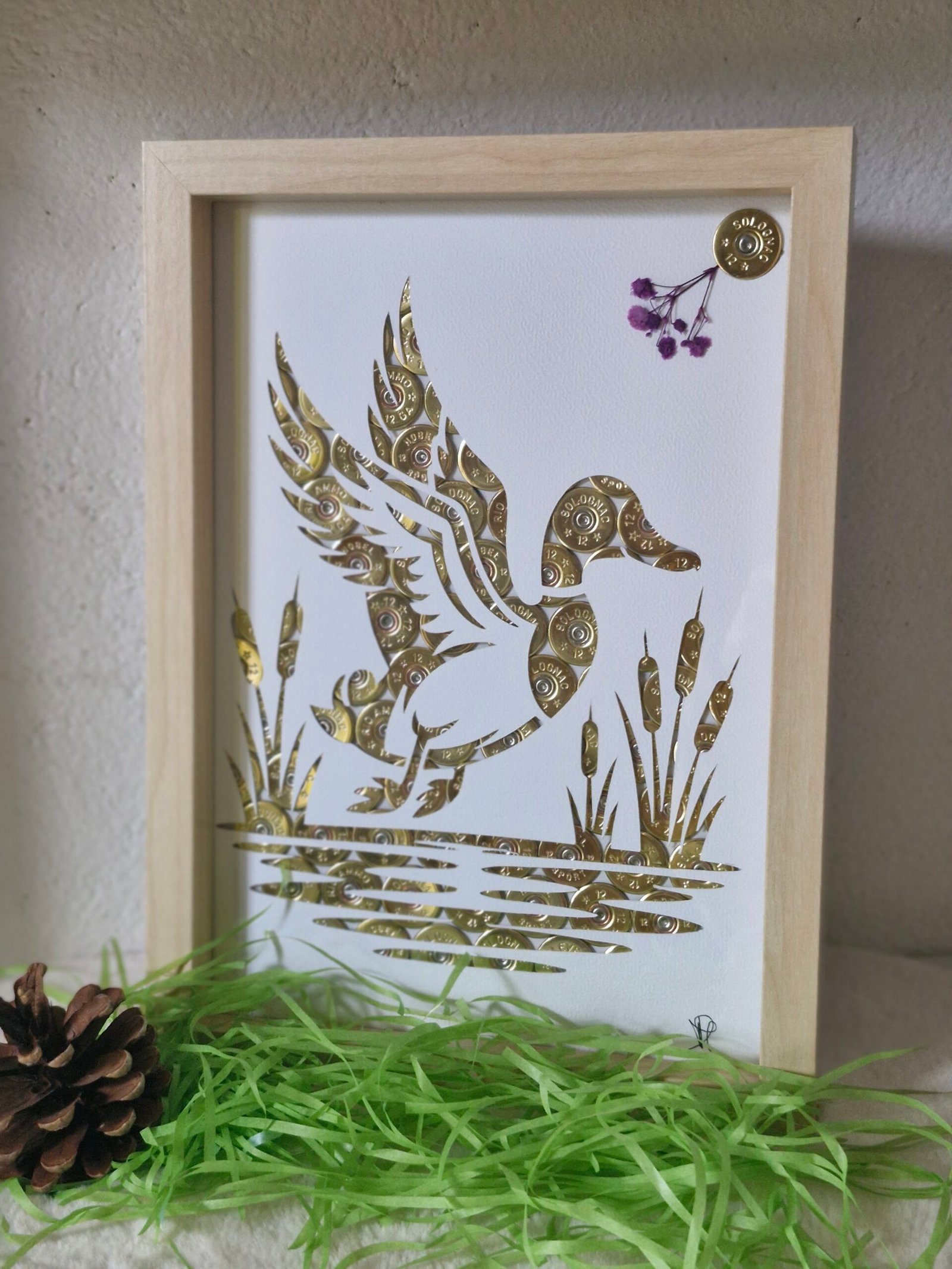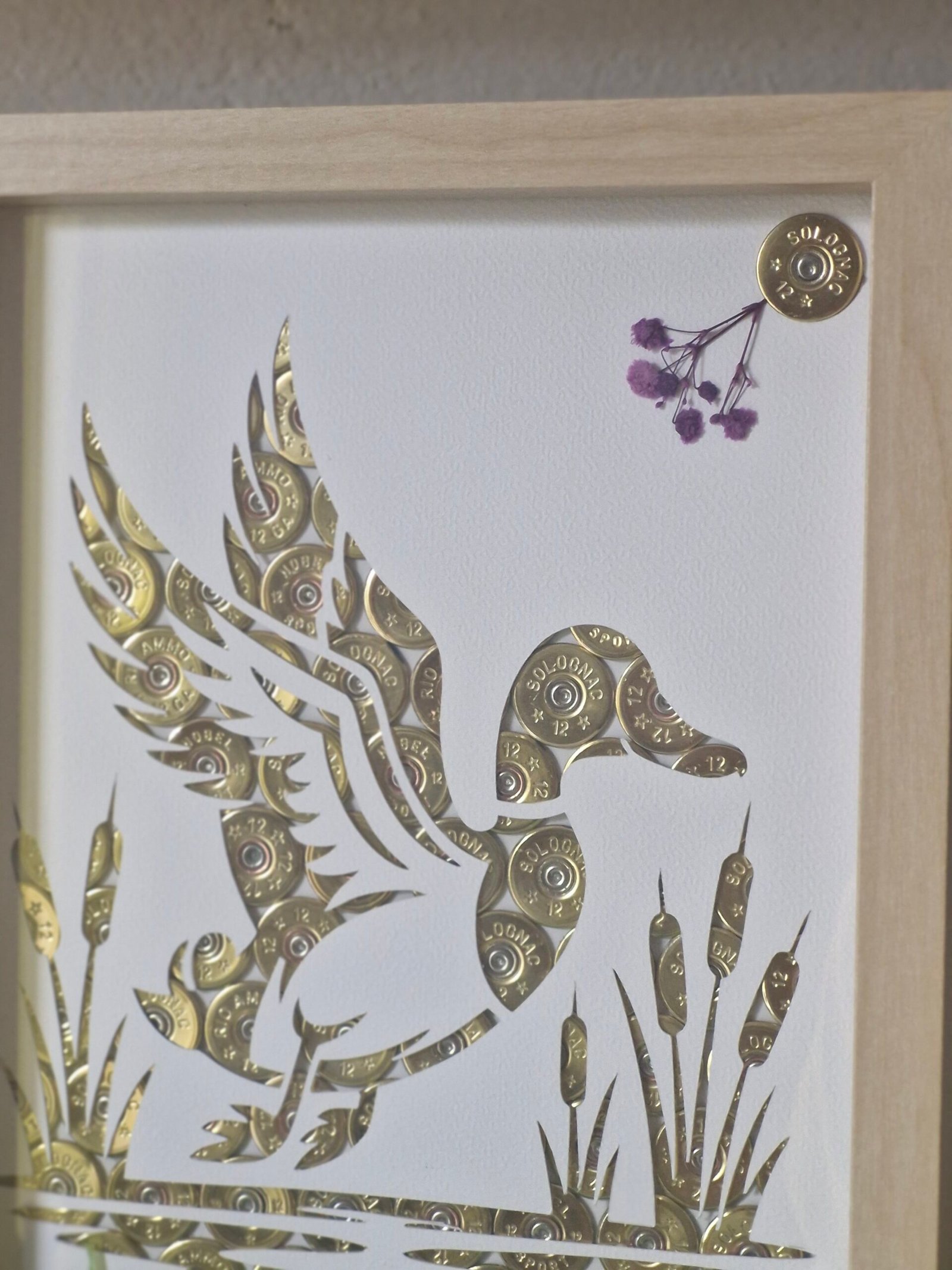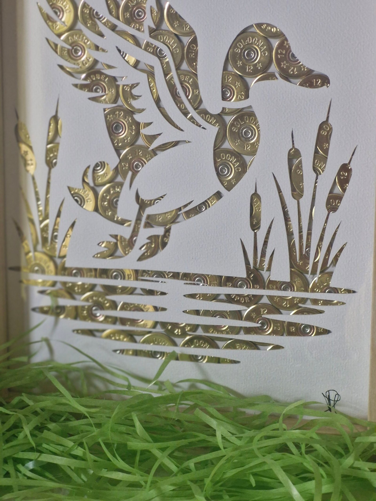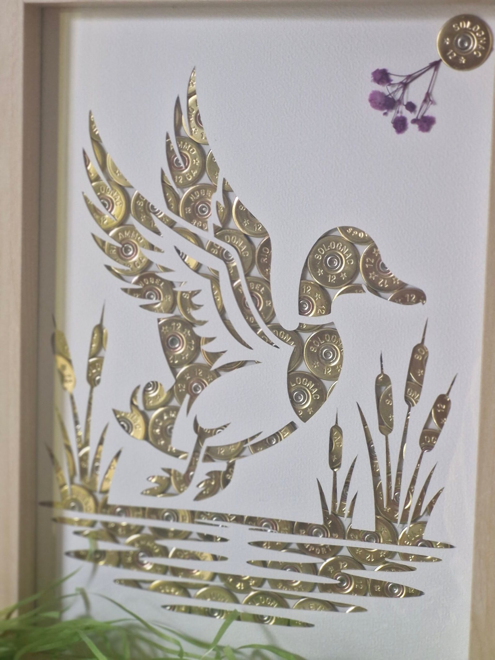 Cadre artisanal représentant canard en envol ,réalisé à partir de cartouches de chasse recyclées .