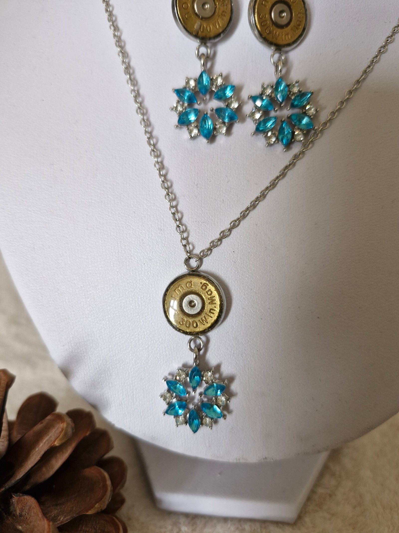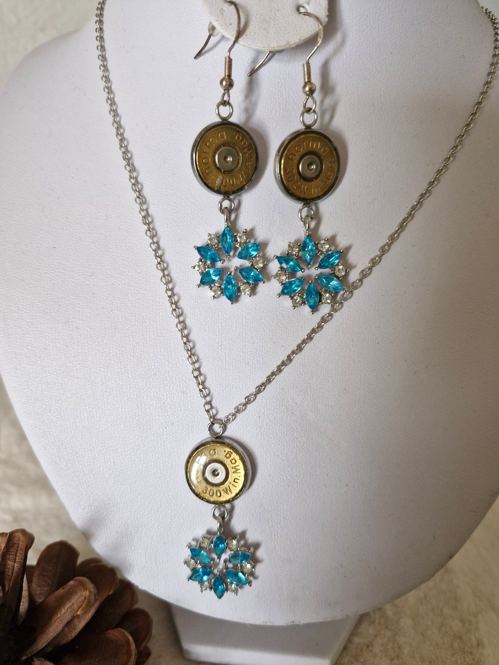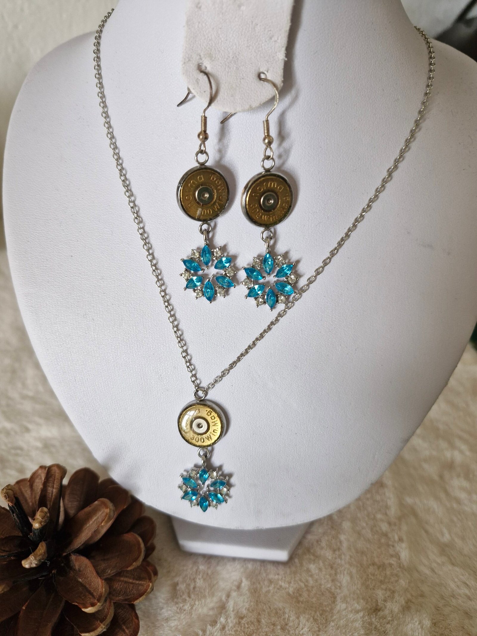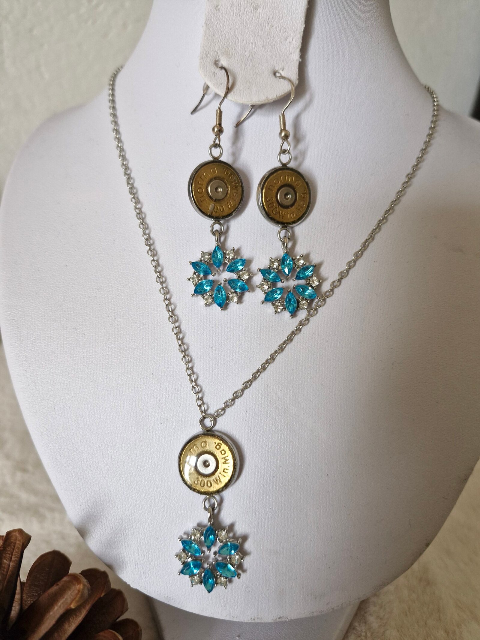Cette ensemble et réalise avec de douille de carabine recycle plus une petite Etoile de couleur bleu , avec de petit strasse o que attire la visibilité quand ce apporte.